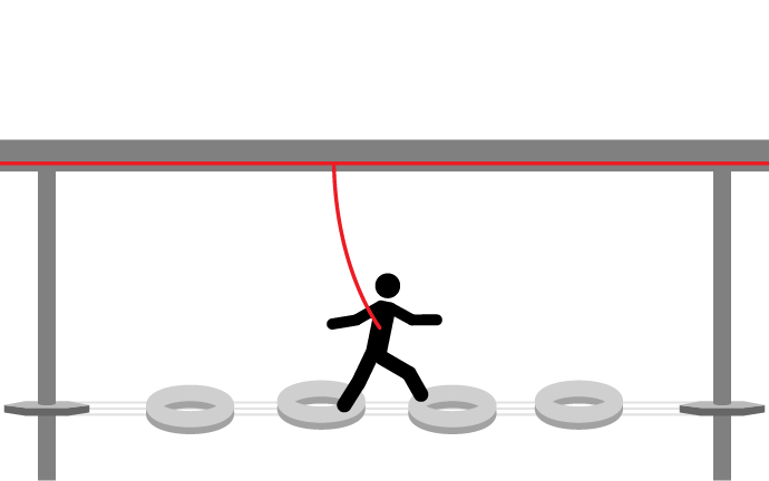 The Tires Alley is a versatile obstacle designed for both indoor and outdoor ropes courses. It is available in four lengths – 4, 5, 6, and 7 meters. This obstacle provides a unique challenge, focusing on flexibility, balance and strength. To pass it, participants need to step from tire to tire, holding your hands out for balance.